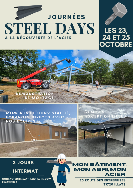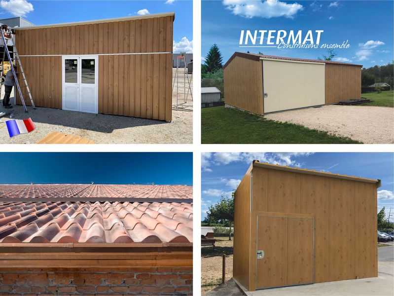 Nos hangars peuvent être équipés pour les animaux d'élevage bovins, ovins ou porcins et des bardage bacs acier imitant les matériaux traditionnels peuvent agrémenter les façades et les toitures. Tous les accessoires pour la fabrication d'abris ou de bâtiments tels que les tôles bac acier, les fixations et les pannes de construction seront en vente sur le stand par le personnel compétent d'Intermat. Notre procédé de fabrication inclu un traitement anticorrosion dû au procédé de galvanisation Sendzimir qui est supérieur aux trempage dans les bains de zinc. Pour visiter notre stand nous pouvons vous offrir des entrées gratuites, il faut nous contacter au 05 56 27 23 32 ou par mail à contact@intermat-aquitaine.com. Notre service montage inclu également la pose aux normes DTU des panneaux sandwichs d'isolation avec du matériel adapté aux grandes hauteurs et un palonnier à ventouses